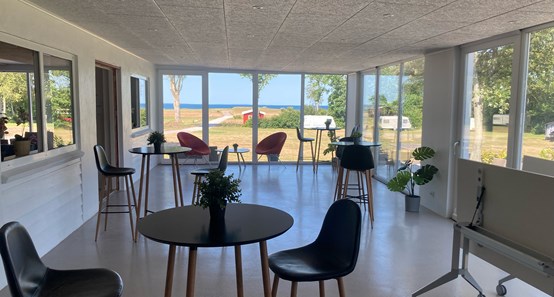 Det ligger midt på pladsen med skøn udsigt, og der er plads til 100 siddende gæster.