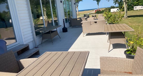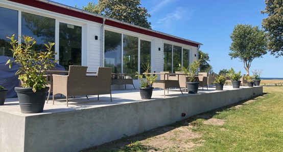Det ligger midt på pladsen med skøn udsigt, og der er plads til 100 siddende gæster.